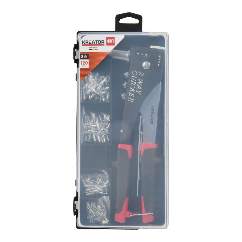 Kreator popszegecsfogó 2 irányba állítható fejjel+ 120db-os popszegecs készlet Pro KRTH62603